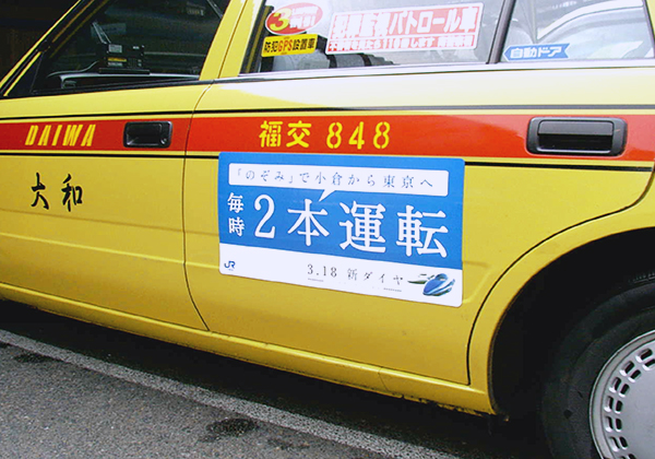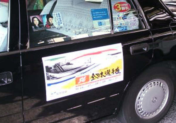 • 視認効果の高いタクシーの後部ドアの左右両面にマグネットシートを設置。
